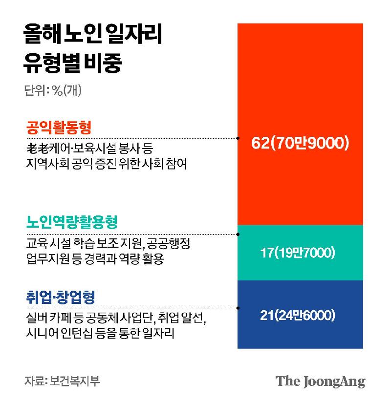 Á¤ºÎ°¡ ³ª¶ùµ·À» µé¿© ¸¸µå´Â ³ëÀÎ ÀÏÀÚ¸® ¼ö°¡ ¿ÃÇØ ¿ª´ë ÃÖ´ë·Î ´Ã¸é¼, °í¿ëÁöÇ¥ ¡®Âø½Ã¡¯µµ ÇÑÃþ ½ÉÇØÁú °ÍÀ̶õ ¿ì·Á°¡ ³ª¿Â´Ù. 65¼¼ ÀÌ»ó °¡¿îµ¥ ÀÏÇϰí ÀÖ´Â »ç¶÷ ºñÁßÀÌ ´Ã¸é¼ Àüü °í¿ë·üÀÌ ¿Ã¶ó°¡°í ÀÖÁö¸¸, û³âÃþÀ» Áß½ÉÀ¸·Î ÀÏÀÚ¸® ÇÑÆÄ´Â ¿©ÀüÇØ¼´Ù. °í·ÉÃþ ºó°ï ¹®Á¦¸¦ °³¼±ÇÏ´Â ³ëÀÎ ÀÏÀÚ¸® »ç¾÷ÀÇ ¼ø±â´ÉÀº »ì¸®µÇ, °æ±â ÆÇ´ÜÀ» È帮°Ô ÇÏ´Â °Ç ¸·´Â Á¦µµÀû ÀåÄ¡°¡ ÇÊ¿äÇÑ »óȲÀÌ´Ù. 3ÀÏ °ü°èºÎó¿¡ µû¸£¸é Á¤ºÎ´Â ¿ÃÇØ ³ëÀÎ ÀÏÀÚ¸®¸¦ ¿ª´ë ÃÖ´ë ±Ô¸ðÀÎ 115¸¸2000°³ °ø±ÞÇÒ ¿¹Á¤ÀÌ´Ù. Áö³ÇØ ¸ñǥġÀÎ 109¸¸8000°³º¸´Ù 5¸¸4000°³(4.9%) ´Ã·È´Ù. À̸¦ À§ÇØ ±¹ºñ¤ýÁö¹æºñ µî ÃÑ 5Á¶¿ø°¡·®ÀÇ ¿¹»êÀ» ÅõÀÔÇÑ´Ù. ³ëÀÎ ÀÏÀÚ¸®´Â 2004³â Á¦µµ µµÀÔ ÀÌÈÄ ²ÙÁØÈ÷ ´Ã°í ÀÖ´Ù. Æò±Õ ¼ö¸íÀÌ ´Ã¸é¼ °è¼Ó ÀÏ Çϱ⸦ ¿øÇÏ´Â °í·ÉÃþµµ ´Ã°í ÀÖÁö¸¸, ¹Î°£ÀÌ À̸¦ ´Ù ¼ö¿ëÇÏÁö ¸øÇÏ´Ù º¸´Ï °ø°ø ºÎ¹® ÀÇÁ¸µµ°¡ Ä¿Áö´Â Ãß¼¼´Ù. »ç¾÷ ½ÃÇà Ã¹ÇØÀÎ 2004³â 3¸¸¿© °³ ¼öÁØÀÌ´ø ³ëÀÎ ÀÏÀÚ¸®´Â 2014³â 33¸¸¿© °³, 2018³â 54¸¸¿© °³·Î ´Ã¾ú°í 2024³â 107¸¸ °³¸¦ µ¹ÆÄÇß´Ù. 65¼¼ ÀÌ»ó Àα¸ ´ëºñ ³ëÀÎ ÀÏÀÚ¸® ¼öÀÇ ºñÁßµµ Ä¿Á³´Ù. 2004³â ³ëÀÎ ÀÏÀÚ¸®´Â ¾à 3¸¸5000°³·Î ´ç½Ã 65¼¼ ÀÌ»ó Àα¸(413¸¸ ¸í)ÀÇ 0.9% Á¤µµ¿¡ ºÒ°úÇß´Ù. ÀÌ ºñÁßÀº 10³â µÚÀÎ 2014³â 5.2%·Î Ä¿Á³°í, 2024³â¿¡´Â 10.5%·Î ÃÖ°íÄ¡¸¦ Âï¾ú´Ù. º¸°Çº¹ÁöºÎ´Â 2027³â±îÁö ³ëÀÎ Àα¸ÀÇ 10%, 2028³âºÎÅÍ´Â 10.7% ¼öÁØÀ¸·Î ³ëÀÎ ÀÏÀÚ¸®¸¦ È®´ëÇØ °í·ÉÈ ¹®Á¦¿¡ ´ëÀÀÇÑ´Ù´Â ¹æÄ§ÀÌ´Ù. Àå·¡Àα¸Ã߰踦 °í·ÁÇϸé 2044³â¿¡´Â ³ëÀÎ ÀÏÀÚ¸®°¡ 192¸¸5000°³ ÀÌ»óÀ¸·Î ºÒ¾î³¯ Àü¸ÁÀÌ´Ù.  ±è°æÁø ±âÀÚ